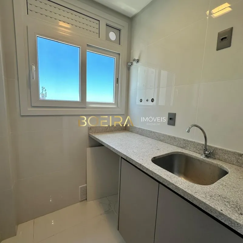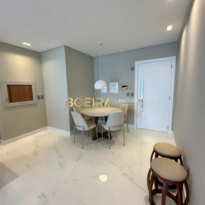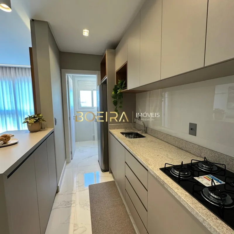 O imóvel é composto por dois dormitórios, sendo uma suíte, sala de estar e jantar integradas com vista para o mar, cozinha funcional, churrasqueira privativa, área de serviço e banheiro social, além de box de garagem.