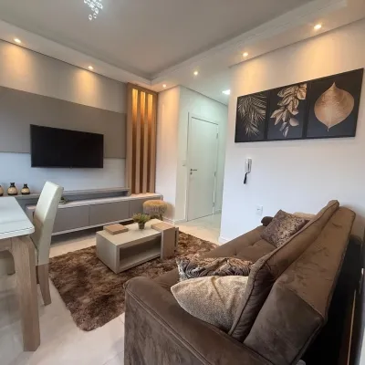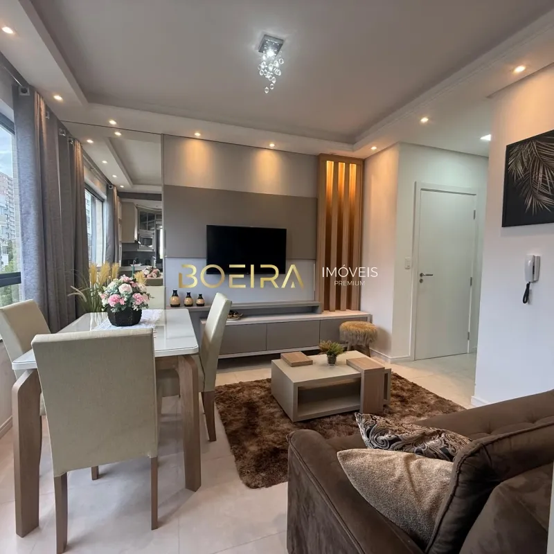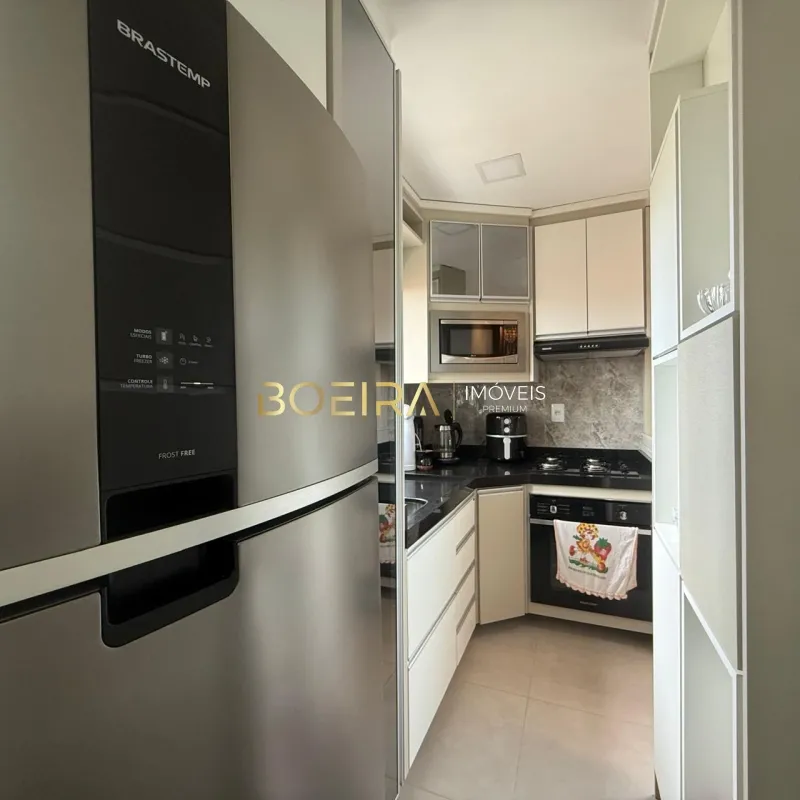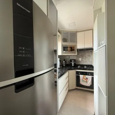 O imóvel é composto por 2 dormitórios, sendo 1 suíte, sala de estar e jantar integradas que proporcionam mais amplitude aos ambientes, cozinha com churrasqueira privativa, área de serviço, banheiro social, box de garagem e depósito.